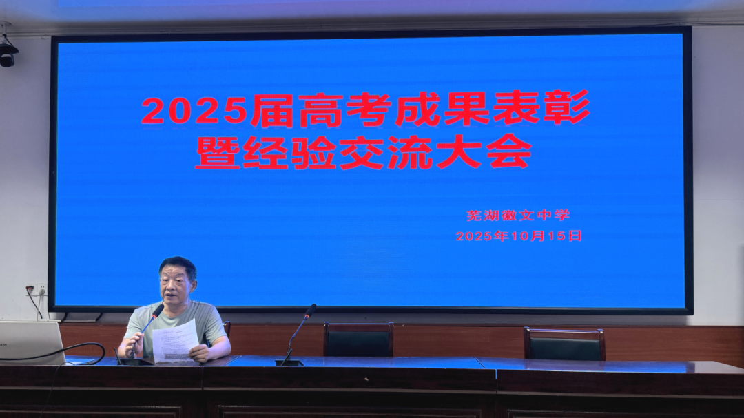 金秋十月,硕果满枝。2025年10月15日,芜湖徽文中学报告厅内暖意涌动、掌声不绝,2025届高考成果表彰暨经验总结交流大会在此隆重举行。全体教职工齐聚一堂,复盘备考点滴、分享育人智慧,为2026届高考备战吹响新号角。大会由教学副校长严肃主持。