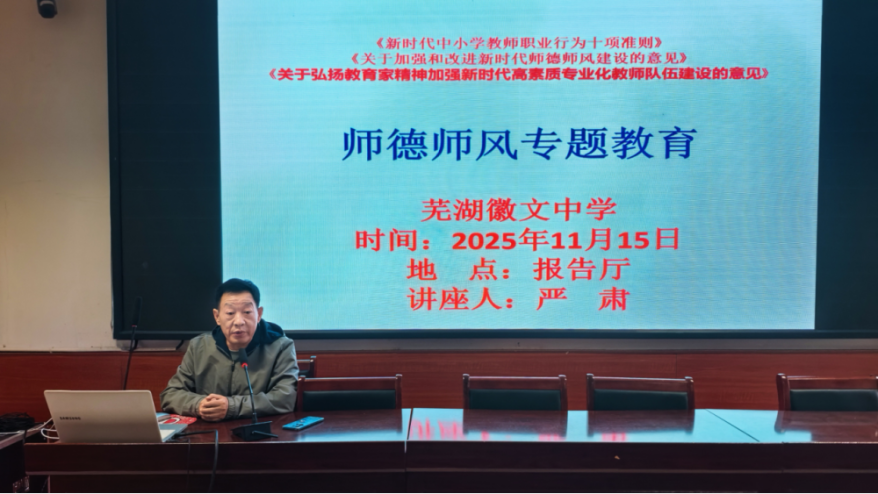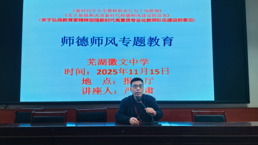 为深入贯彻师德师风建设相关政策要求,切实提升教师队伍素养,2025年11月15日,芜湖徽文中学在报告厅举办了一场意义非凡的师德师风专题教育报告会。本次会议由执行校长袁明亮主持,全体教师齐聚一堂,共同开启这场关于师德师风提升的学习之旅。