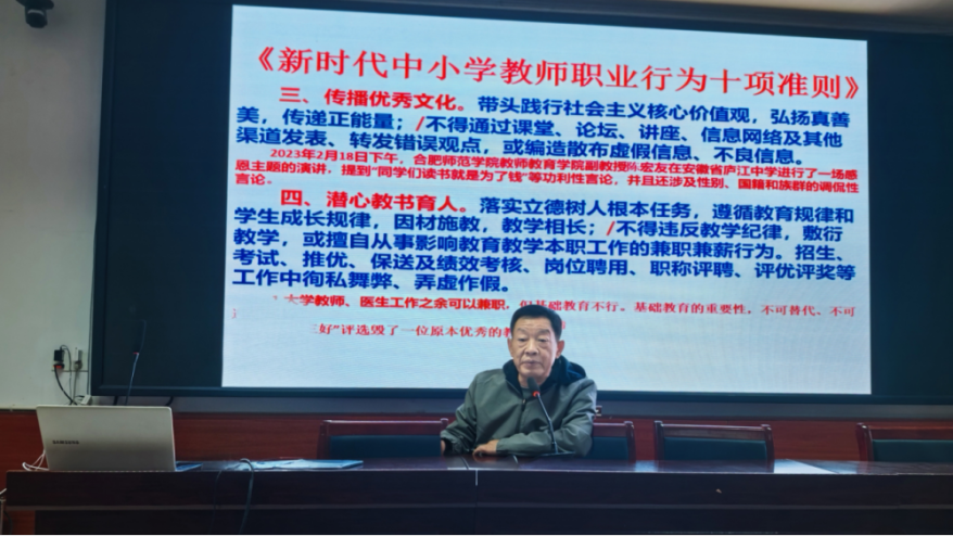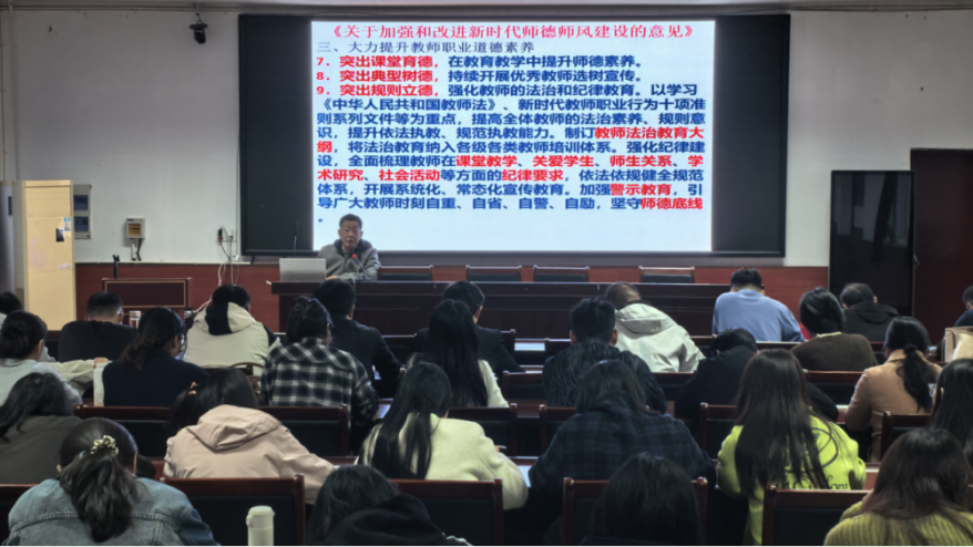 本次报告由教学副校长严肃同志担任主讲人,以三大政策文件为核心指引,系统解读师德建设方向与要求:一、深入解读《新时代中小学教师职业行为十项准则》,明确教师职业行为底线,引导教师规范教育教学言行;